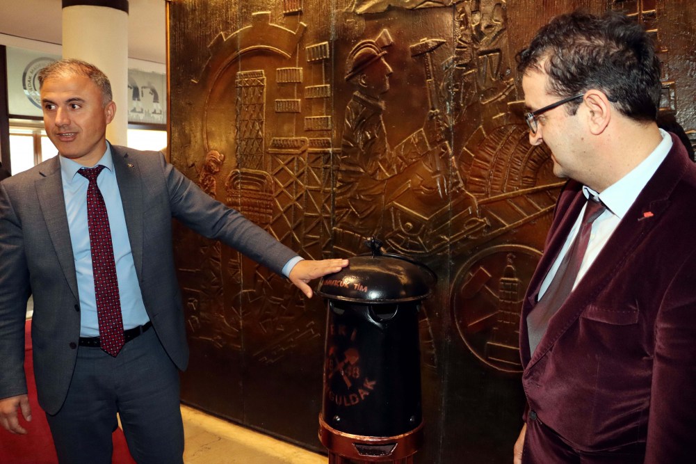 Genel Maden İşçileri Sendikası’nı (GMİS) ziyaret eden Türkiye Taşkömürü Kurumu (TTK) Armutçuk Müessesesi Müdürü Faik Alp, yöneticiler ve işçiler, atölyelerinde yapılan 170 santimetre boyundaki madenci fenerini sendikaya hediye etti.