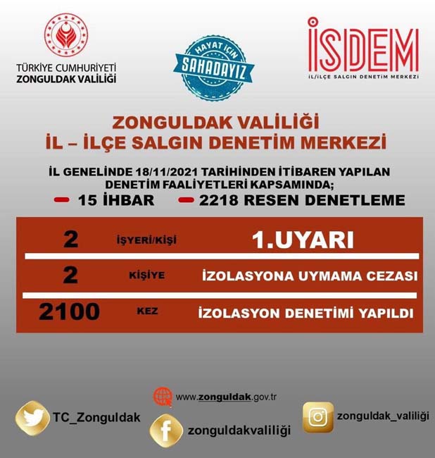 Zonguldak Valiliği İSDEM sonuçları açıklandı. İl genelinde 18 Kasım 2021 tarihinden itibaren yapılan denetim faaliyetleri kapsamında 15 ihbar 2 bin 218 resen denetleme gerçekleştirildi. 2 işyeri ve kişiye birinci uyarı yapıldı. 2 kişiye izolasyona uymama cezası uygulandı. İki bin 100 kez izolasyon denetimi yapıldı.
