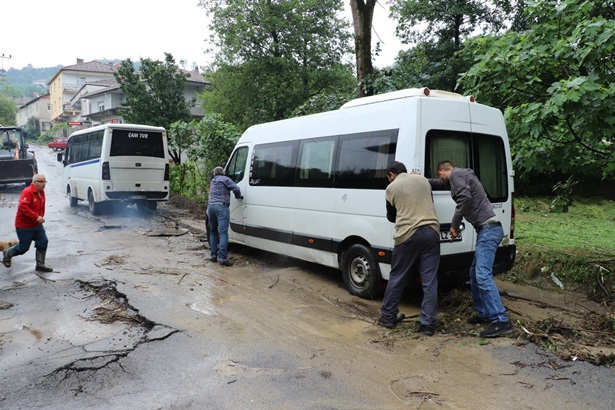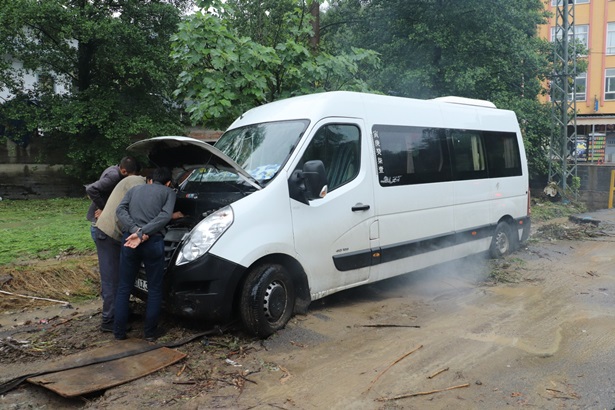 Sel suyu içinde kalan ve arıza yapan minibüs başka bir araç