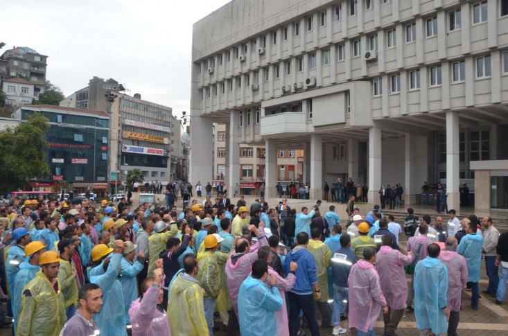 işçileri, eylemin ikinci gününde yağmurluklarını giyerek Valiliğe yürüdü.