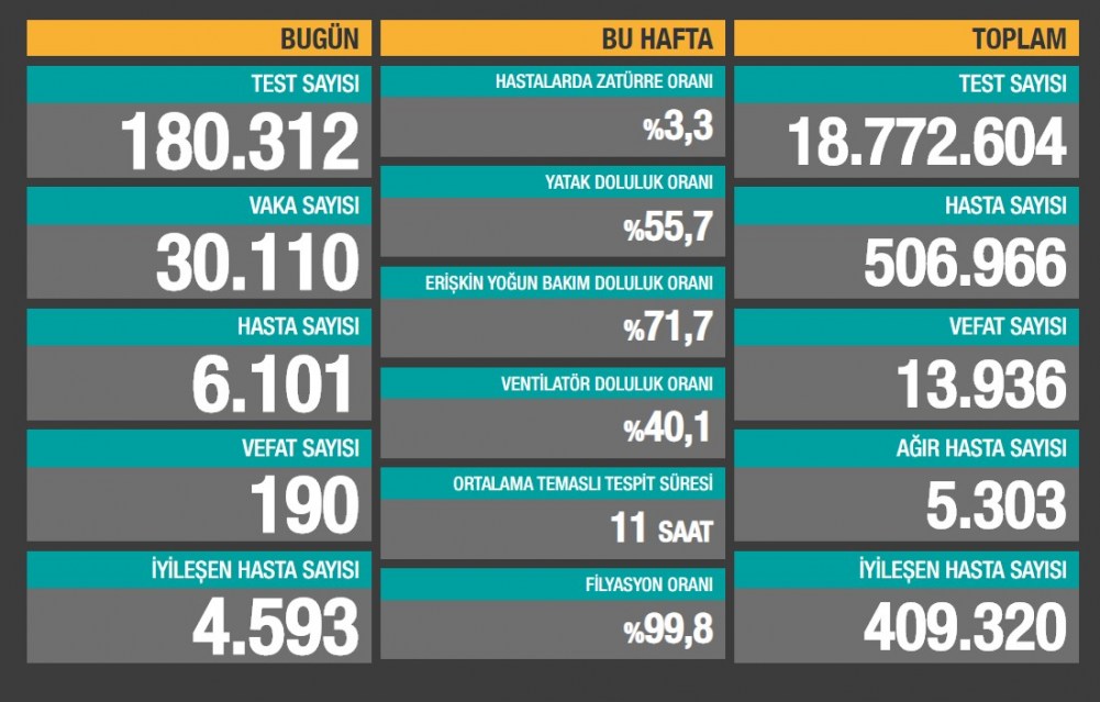 Sağlık Bakanlığı son 24 saatte 190 kişinin korona virüsten hayatını kaybettiğini, 30 bin 110 yeni vaka sayısının olduğu açıkladı.