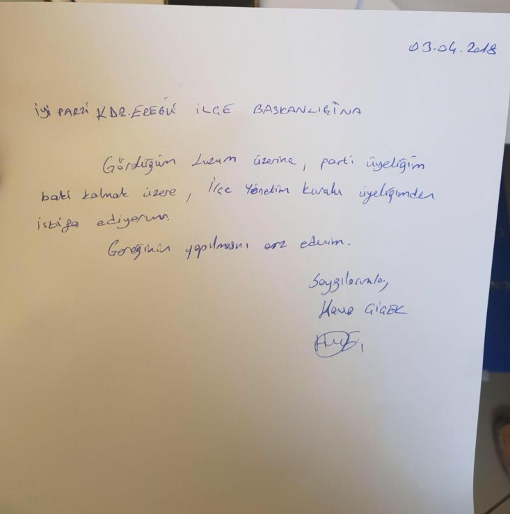 Zonguldak'ın Ereğli ilçesi İYİ parti ilçe yönetiminde istifaların ardı arkası kesilmiyor. Yönetim Kurulu üyeleri Uğur Dursun Yılmaz ve Ahmet Erol'un ardından yönetim kurulu üyesi Hava Çiçek'de istifa ettiğini duyurdu.