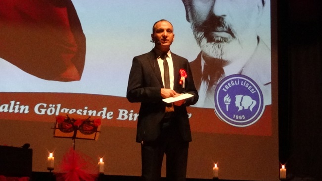 Saygı Duruşu ve İstiklal Marşı’mızın okunmasının ardından Törenin açılış konuşmasını Ereğli Lisesi Müdürü İbrahim Aydın yaptı. Aydın konuşmasında “ Bugün İstiklal Marşı’mızın kabulünün 100. Yılını kutluyoruz. Vatan ve millet sevgisinin, bağımsızlık ve hürmet aşkının en güzel ifadesi olan İstiklal Marşımızı bize armağan eden Milli şairimiz Mehmet Akif Ersoy'u saygıyla anıyoruz. Bayrağımız ve onun hürriyetini ebedîleştiren İstiklal Marşımız milletimizin ruhunu, tarihini ve ideallerini aksettiren ölmez bir şaheserdir. İstiklal marşımızı sevmek ülkemizi sevmektir. İstiklal Marşımızı coşkuyla söylemek ve okumak ülkemize ve bağımsızlığımıza sahip çıkmaktır. Ve nihayetinde bağımsızlığımıza sahip çıkmak da milli onurumuza sahip çıkmaktır. İstiklal marşımızı anlayabilmek ve bu sağladığı değerlerini kavrayabilmek için Mehmet Akif’i çok iyi tanımak, bilmek ve onun şahsında topladığı "Milli mücadele ruhunu, vatan sevgisini, Allah İnancını "Bu yüce duygularla ortaya çıkan "vatan, ulus ve hürriyeti kavramlarını damarlarımızda dolaşan o asil kanda hissetmek gerekir. Mehmet Akif, hem milli bir Şair, ideal bir öğretmen, iyi bir veteriner, cesur bir gazeteci hem de Kurtuluş Savaşı'nda iyi bir asker, Türk gencine ufuk çizen bir fikir adamı, bir politikacı olmayı başarabilmiştir. Aynı zamanda bir gönül insanı olduğunun da kanıtı olarak vatan hasret' ile biten hayatında vefa beklediği gözlerde de maalesef cefa çeken bir '-garip" olmuştur. Mehmet Akif bu ülkede nefes alan tek kişi kalsa dahi ülke için umut ışığının sönmeyeceği inancı ile vatanın geleceği genç kuşaklara olan yol göstericiliğiyle ve İslamcı fikrinden esinlenerek tüm dünya Müslümanlarının birliği isteğiyle Türk milleti için önemli bir şahsiyetti. Şanlı atalarımız. Şehit dedelerimiz bize bu güzel vatanı miras bıraktı Bizler de gelecek nesillere bu kutsal emaneti en güzel şekilde taşıyacağız_ Unutmamalıyız ki omuzlarımızda geleceğin sorumluluğu vardır Bu sorumluluğu taşımak da öyle kolay değildir. Çok Çalışmak ister, fedakârlık ister Gelecek nesillere güçlü bir ülke bırakmak ise geçmişimizi doğru bilmek ve öğretmekten geçer. Konuşmama son verirken Ulu Önder Mustafa Kemal Atatürk, aziz şehitlerimiz ve İstiklal şairimiz merhum Mehmet Akif Ersoy'u şükran ve minnetle yad ediyorum. Ruhları şad olsun. Hepinizi bu duygu ve düşünceler içinde saygıyla selamlıyorum” dedi.