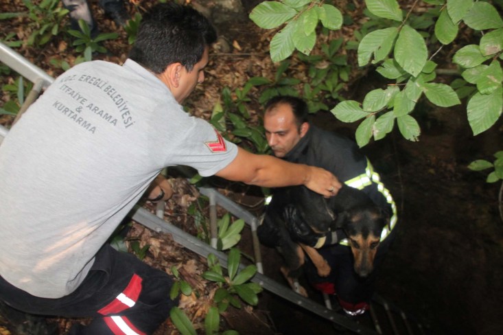 Karadeniz Ereğli Belediye İtfaiye Müdürlüğü Ekipleri dağda açılan kuyuya düşen köpeği ormanlık alanda 5 kilometre yürüdükten sonra kurtardı. Özgürlüğüne kavuşan köpek koşarak uzaklaşırken, itfaiye erleri ve köpeği bulan vatandaş ise zorlu yollardan dönüş yaptı.