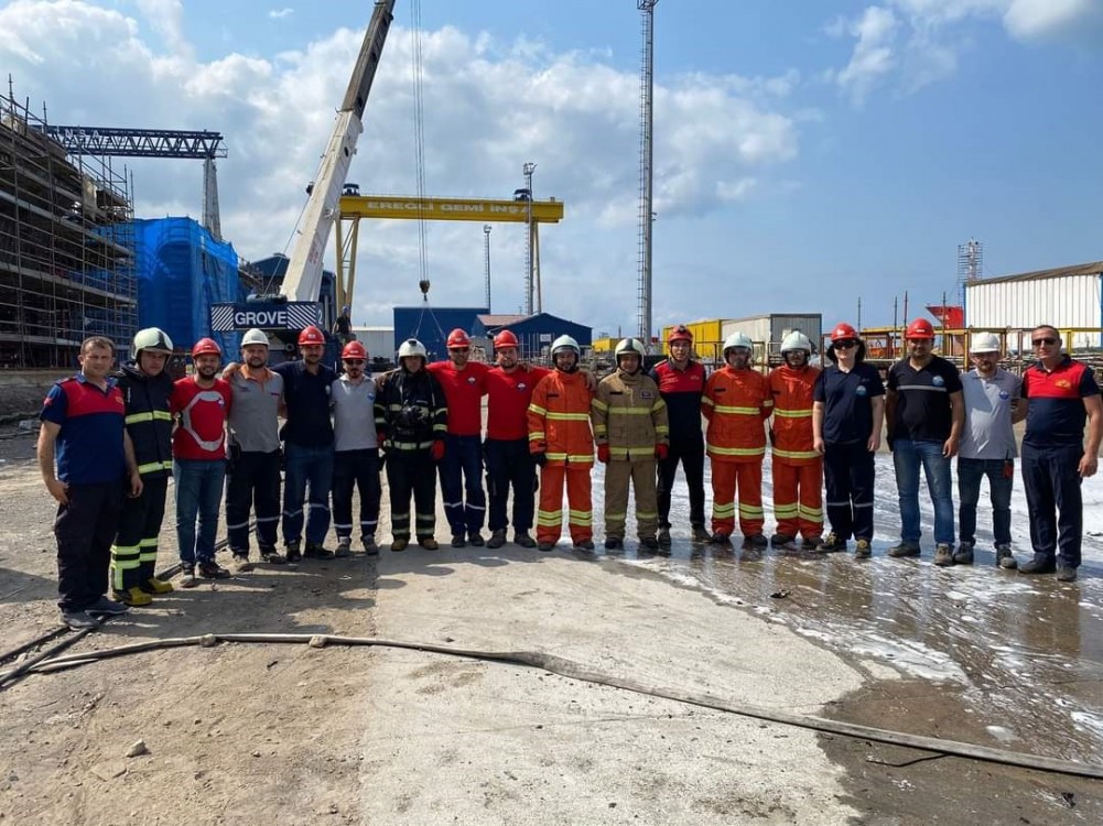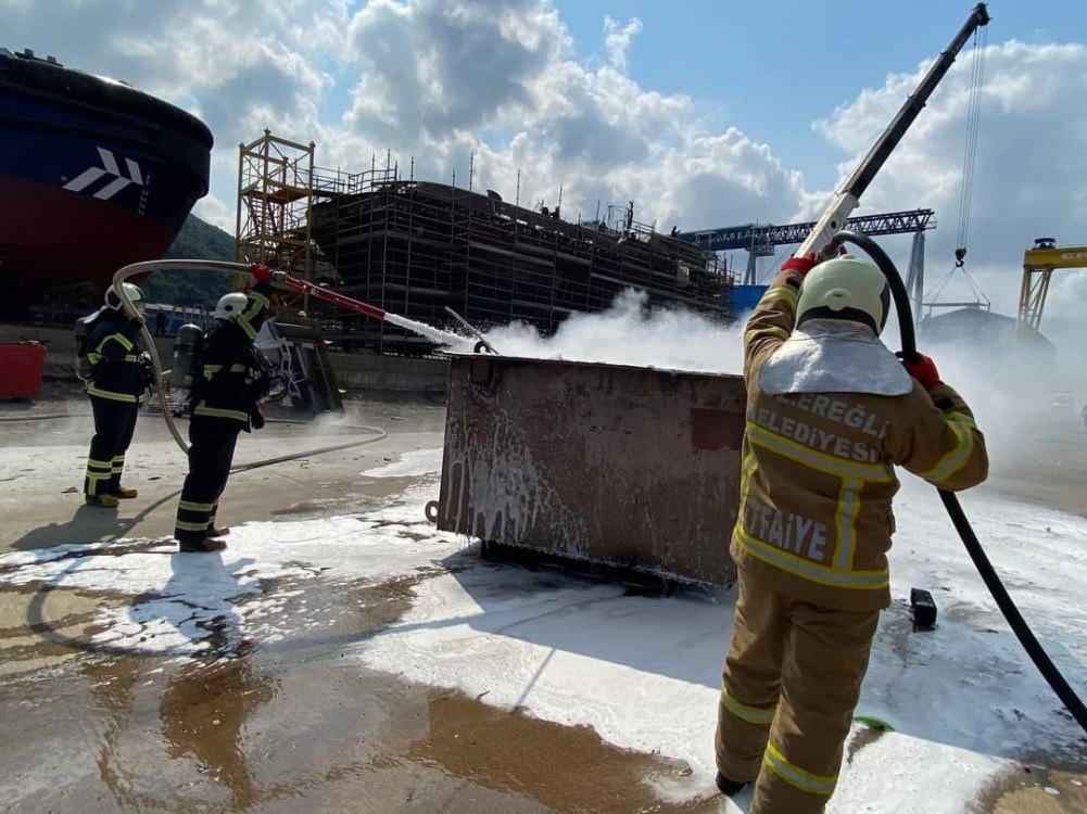 Zonguldak Ereğli Belediyesine bağlı İtfaiye Müdürlüğü Eğitim Birimi Ereğli Gemi İnşa ve Ticaret A.Ş. çalışanlarına Afet ve Acil Durum Tatbikatı eğitimi verdi.