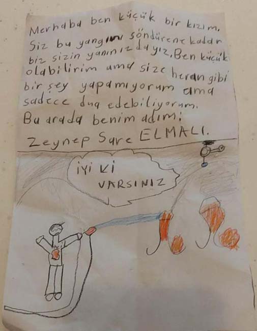 Nöbet tuttukları sırada, ailesiyle birlikte itfaiye personelinin yanına gelen küçük Zeynep, altına alev toplarına su sıkan bir itfaiyeci resmi de çizdiği bir kâğıdı ekibe verdi. Nottaki, "Merhaba, ben küçük bir kızım. Siz bu yangını söndürene kadar biz sizin yanındayız. Ben küçük olabilirim, size bir şey yapamıyorum ama sadece dua edebiliyorum. Bu arada benin adım: Zeynep Sare Elmalı. İyi ki varsınız." ifadeleri personelin duygulanmasına neden oldu.