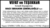 İZMİRLİOĞLU Ailesi 09 Şubat Pazartesi günü hayata gözlerini kapayan aile büyükleri Hacı İbrahim İZMİRLİOĞLUİZMİRLİOĞLU 'nun vefatında kendilerini yalnızbıerakmayan, bizaat cenazeye gelen, telefonla arayıp başsağlığı mesajlarını iletenlere teşekkür etmek amacıyla bir mesaj yayınladı.