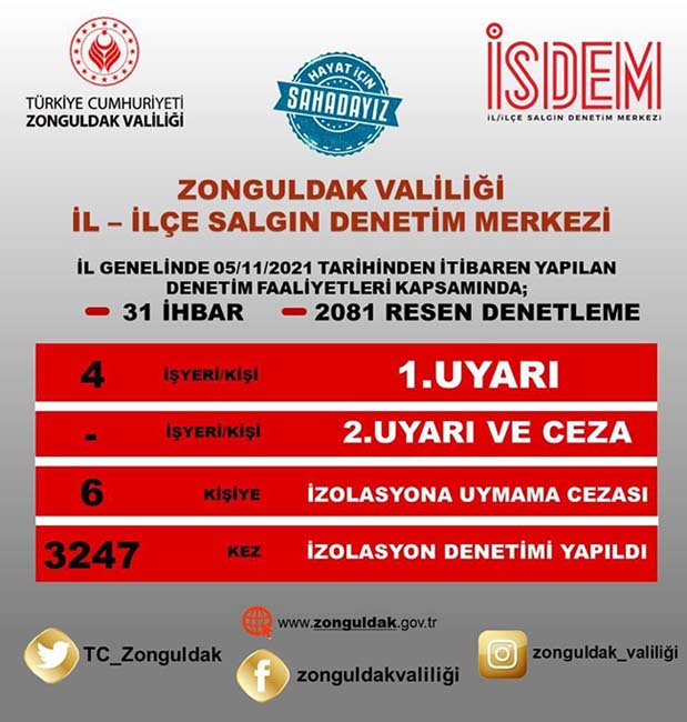 Zonguldak'ta il-ilçe salgın denetim merkezi tarafından il genelinde denetim gerçekleştirdi. 31 ihbara karşılık 2 bin 81 resen denetleme yapıldı. 4 işyeri/kişiye birinci uyarı verildi. 6 kişiye ise izolasyona uymama cezası uygulandı. 3 bin 247 kez izolasyon denetimi yapıldı.