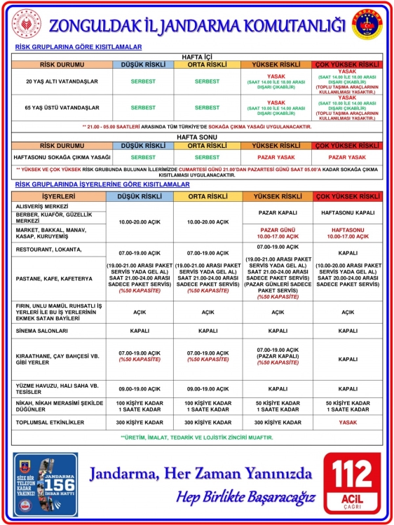 Zonguldak İl Jandarma Komutanlığı, risk gruplarına göre kısıtlamalar hakkında bilgi verdi.