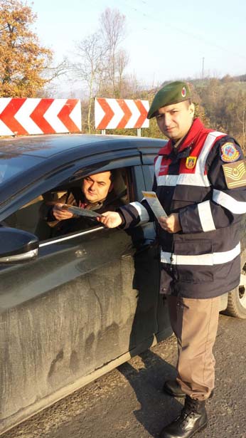 Zonguldak'ın Ereğli ilçesinde İlçe Jandarma Komutanlığı Trafik Büro Amirliği tarafından araç sürücülerine kış şatlarında uyulması gereken kuralların anlatıldığı broşür dağıtıldı.