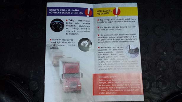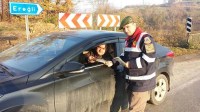 Ereğli İlçe Jandarma Komutanlığına bağlı Trafik Timleri, Deli hakkı mevkiinde uygulama yaptı. Gerçekleştirilen uygulamada sürücülere kış şartlarında araç sürücülerinin yapması gereken ve uyumaları gereken kurallar anlatılan broşür dağıtıldı. Dağıtılan broşürlerde Araçlar için doğru lastiklerin mevsime uygun lastik olması , diş derinliğinin 1,6 milimetrenin altında olması durumunda mutlaka yenileri ile değiştirilmesi gerektiği, aracın yol temasını sağlayan tek bağlantı noktasının lastik olduğu gibi temel bilgiler yer alırken, özellikle kış aylarında araç takip mesafesine çok dikkat edilmesi gerektiği, durmak için ani fren yerine vites küçültülerek motor frenini kullanmaları gerektiği yer aldı.