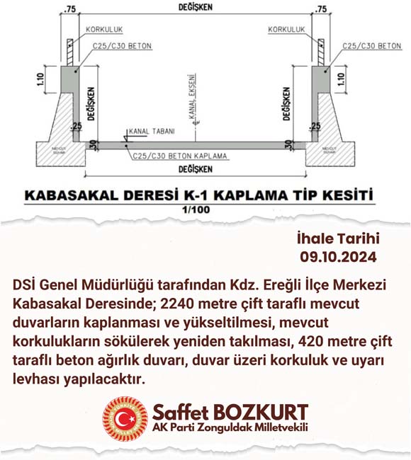 “DSİ Genel Müdürlüğü tarafından Kdz. Ereğli İlçe Merkezi Kabasakal Deresinde; 2240 metre çift taraflı mevcut duvarların kaplanması ve yükseltilmesi, mevcut korkulukların sökülerek yeniden takılması, 420 metre çift taraflı beton ağırlık duvarı, duvar üzeri korkuluk ve uyarı levhası yapılacaktır” denildi
