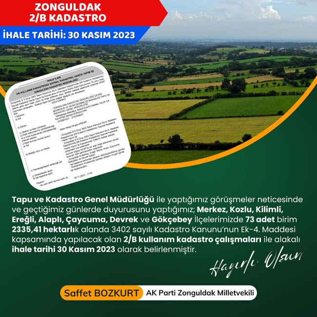 "Tapu ve Kadastro Genel Müdürlüğü ile yaptığımız görüşmeler neticesinde ve geçtiğimiz günlerde duyurusunu yaptığımız; Merkez, Kozlu, Kilimli, Ereğli, Alaplı, Çaycuma, Devrek ve Gökçebey İlçelerimizde 73 adet birim 2335,41 hektarlık alanda 3402 sayılı Kadastro Kanunu’nun Ek-4. Maddesi kapsamında yapılacak olan 2/B kullanım kadastro çalışmaları ile alakalı ihale tarihi 30 Kasım 2023 olarak belirlenmiştir. Hayırlı Olsun." dedi