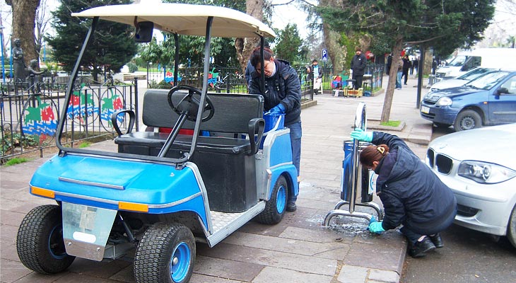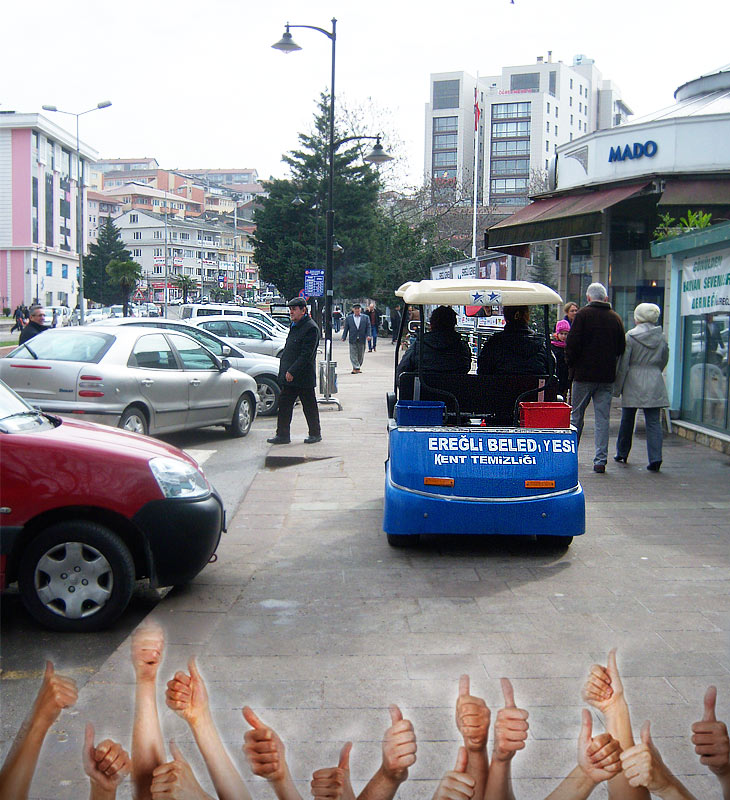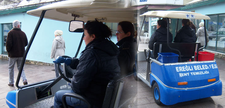 Kdz Ereğli Belediyesi Temizlik İşleri Müdürlüğüne bağlı çalışan temizlik işçileri Nilüfer Çiv ve Nurşan Çaplan, Belediye Başkanı Halil Posbıyık'ın (CHP) talimatı ile tahsis edilen golf arabasıyla, sahil şeridini bir uçtan diğer uca temizliyor. Sahil bandında bulanan banklar ile çöp kutularını yıkayıp temizleyen iki bayan işçi, yaptıkları işle gurur duyduklarını söylüyor. Bir yandan, 2012 Ocak ayından itibaren kendilerine tahsis edilen golf arabasını kullanan bayanlar, bir yandan da Ereğli'yi köşe bucak pırıl pırıl temizliyor.