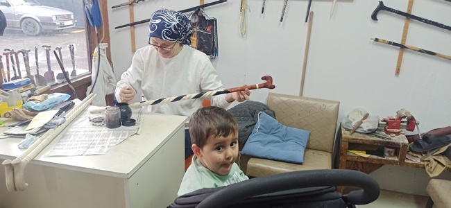 20 yıllık Fatime usta bir eliyle torun sallıyor, diğer eliyle dünyaca ünlü bastonlara şekil veriyor.
