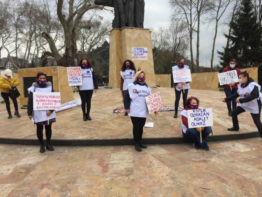 Ellerinde, üzerlerinde ‘İstanbul Sözleşmesinin Feshine” yönelik tepkiler içeren dövizlerle Anıt önünde açıklama yapan kadınlar da, “Değil gece yarısı kararnamesi, yeri yarsanız, göğü başımıza geçirseniz haklarımızdan da hayatlarımızdan da vazgeçmeyeceğiz. Haklarımızın ve hayatlarımızın teminatı olan İstanbul Sözleşmesini savunacağız. İstanbul Sözleşmesi bizimdir, vazgeçmeyeceğiz” diyerek, alınan kararı protesto ettiler.