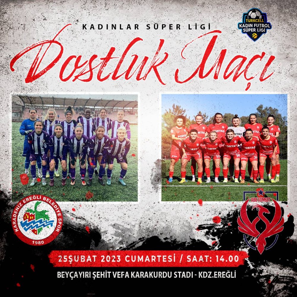 Deprem felaketinde verilen arada hazırlıklarını sürdüren Kadınlar Süper Ligi temsilcileri Kdz.Ereğli Belediyespor ve ABB Fomget, 25 Şubat Cumartesi Günü dostluk maçında Şehit Vefa Karakurdu (Beyçayırı) Stadı’nda buluşuyor.
