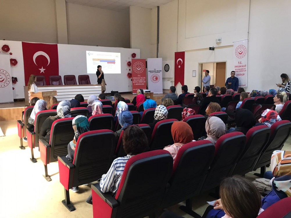 Aile, Çalışma ve Sosyal Hizmetler Bakanlığınca hazırlanan ve 2018-2023 yıllarını kapsayan ‘Kadının Güçlenmesi Strateji Belgesi ve Eylem Planı’nda yer alan çalışmalara esas farklı kurum ve kuruluşların katılımı ile Devrek ilçesinde gerçekleşen 90 kadının katıldığı eğitim seminerinde; İş ve Meslek Danışmanı Belkıs Akın tarafından kadınlar için hizmetleri hakkında bilgiler verildi.