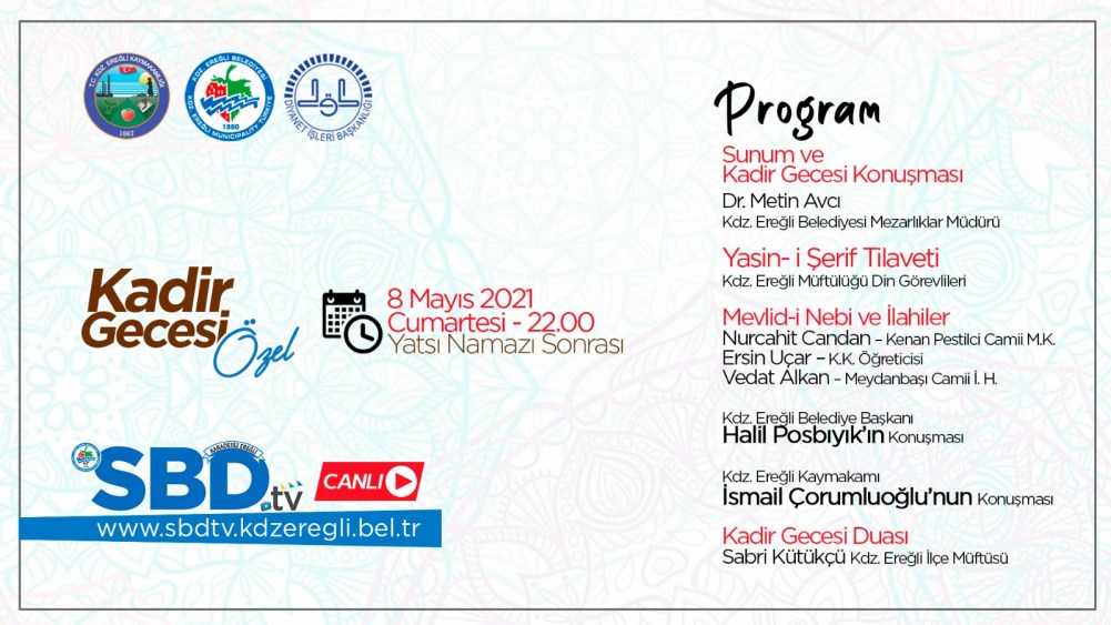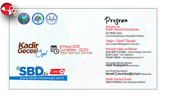 Kdz. Ereğli Belediyesi, 8 Mayıs Cumartesi idrak edilecek Kadir Gecesi için özel program hazırladı. Kdz. Ereğli Belediyesi Mezarlıklar Müdürlüğü ve İlçe Müftülüğü işbirliğiyle düzenlenecek Kadir Gecesi Mevlid Programı, saat 22.00’de başlayacak ve şehrin 20 ayrı tepe noktasına kurulacak hoparlör sisteminden takip edilebilecek. Kadir Gecesi Programı, belediyenin televizyonu SBD.tv’den canlı olarak yayınlanacak.