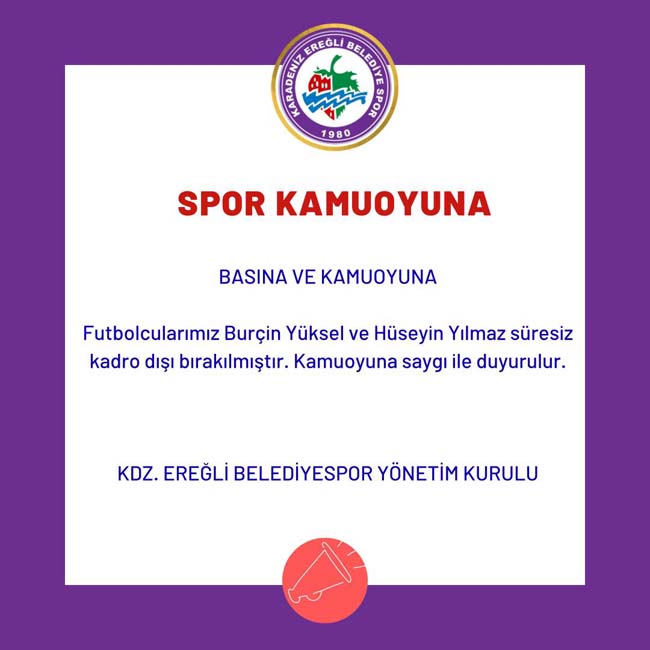 Kdz. Ereğli Belediyespor Kulübü, oyuncularından Burçin Yüksel ve Hüseyin Yılmaz'ı kadro dışı bıraktığını duyurdu.