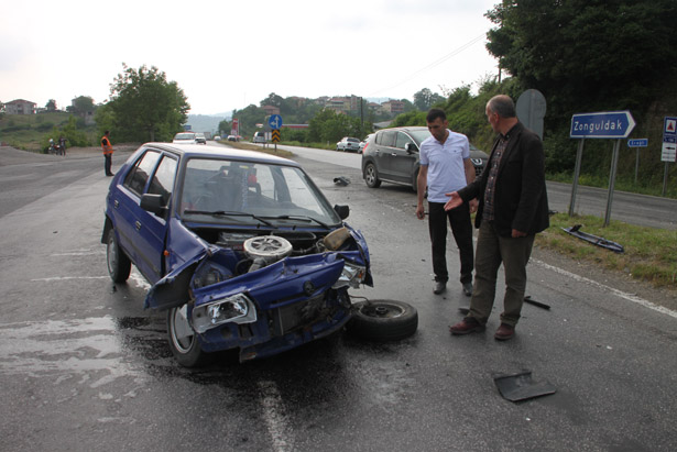 Zonguldak'ın Ereğli ilçesinde tali yoldan yola çıktığı iddia edilen otomobil sürücüsü iki otomobile çarparak durabildi. Kazada biri çocuk iki kişi yaralanırken otomobillerden ikisi de hurdaya döndü.