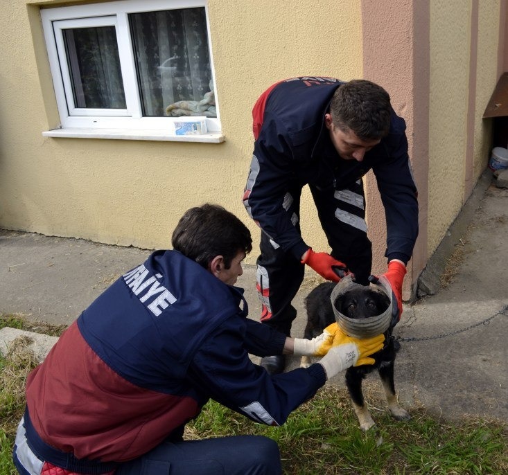 Zonguldak'ın Alaplı ilçesinde kafasına plastik bidon sıkışan köpek itfaiye ekiplerinin müdahalesi sonrasında kurtarıldı.