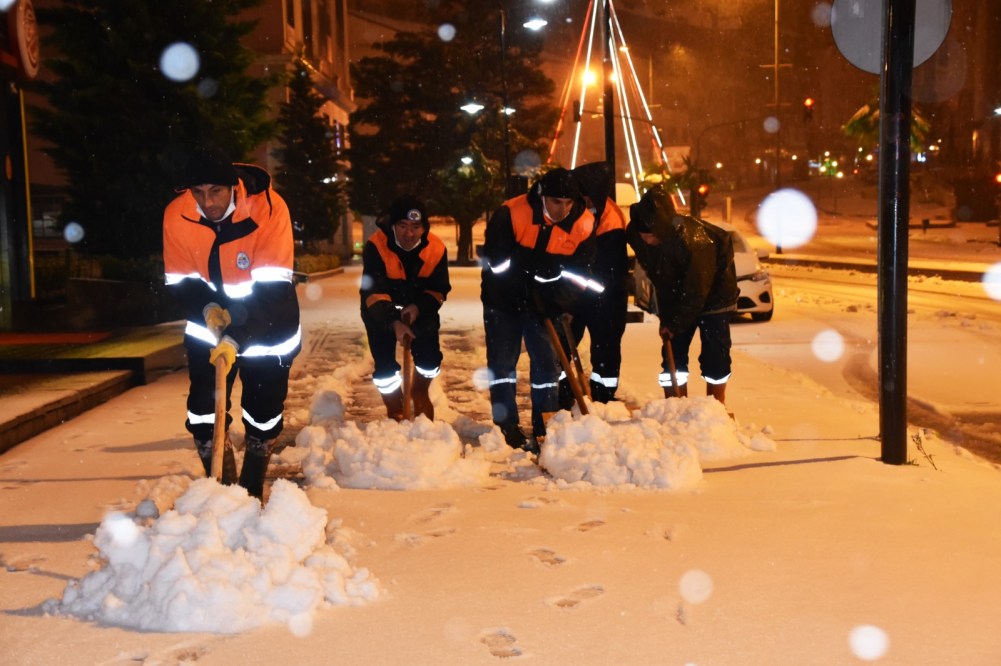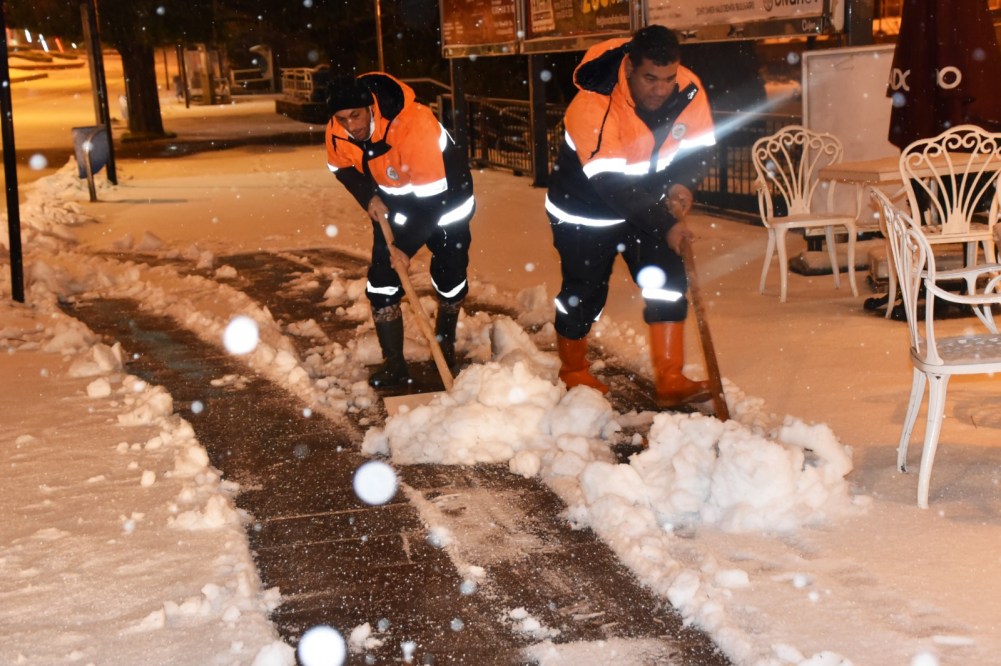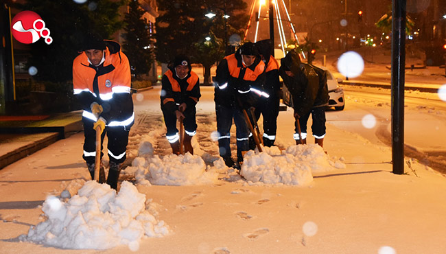 Belediye Temizlik İşleri Müdürlüğü’ne bağlı ekipler, diğer müdürlüklerin de personel desteğiyle sabahın ilk ışıklarıyla beraber çarşı merkezi ile işlek caddelerde yayalar için kar temizliğine başladı.
