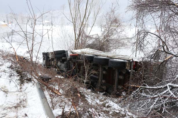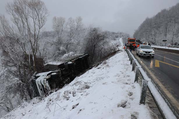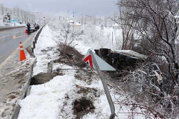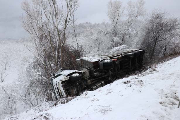 Düzce’de, D-100 karayolunda seyir halindeyken kar nedeniyle kayganlaşan yolda kontrolden çıkan kamyon şarampole şarampole yuvarlandı. Kazada, araçta bulunan yolcu yaralandı.