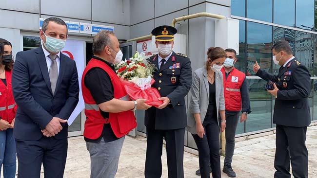Program öncesi Türk Kızılay Zonguldak Şube Başkanı Aydın Ergenç, İl Jandarma Komutanı Albay Gönen Süslü'ye çiçek takdim etti.
