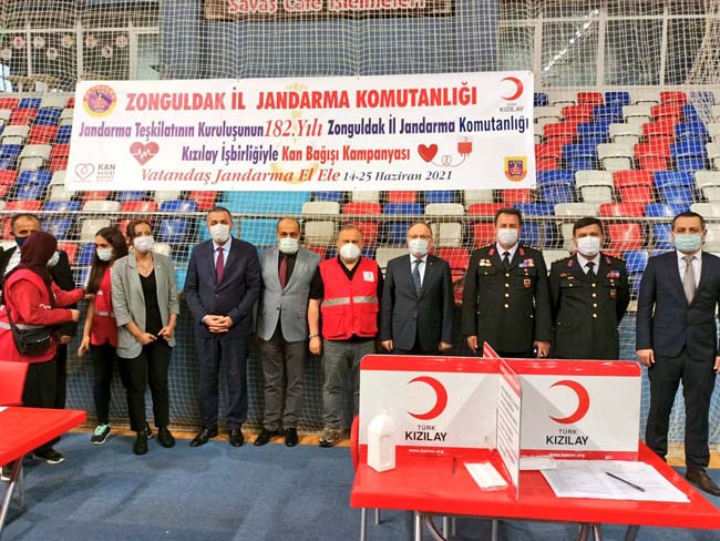 Jandarma Teşkilatının Kuruluşunun 182'nci yıldönümü nedeniyle Türk Kızılay Zonguldak Şubesi ve Zonguldak İl Jandarma Komutanlığı işbirliğinde Site Kapalı Spor Salonu'nda kan bağışı kampanyası düzenlendi. İl Jandarma Alay Komutanı Albay Gönen Süslü, İl Jandarma Komutan Yardımcısı Musa Menteşe ve askeri personel kan bağışında bulundu.