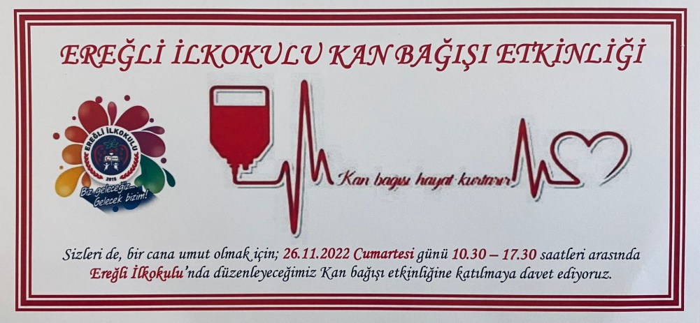 Ereğli İlkokulu idaresi tarafından yapılan açıklamada, Zonguldak'ın Ereğli ilçesi Ereğli İlkokulu'nda 26 Kasım Cumartesi günü kan bağışı ve kök hücre bağışı etkinliği düzenleneceği bildirildi.