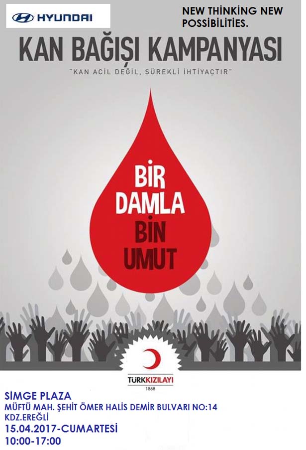 Hyundai Simge Plaza'dan konuya ilişkin yapılan açıklamada: "15 Nisan Cumartesi günü H 'Bir Damla Bin Umut' sloganıyla Kan Bağışı Kampanyamızı 10.00-17.00 saatleri arasında gerçekleştireceğiz.