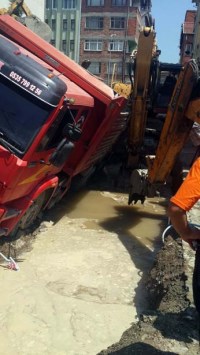 ilçesinde hafriyat yüklü kamyon kanalizasyon kanalına yanaştığı sırada toprak