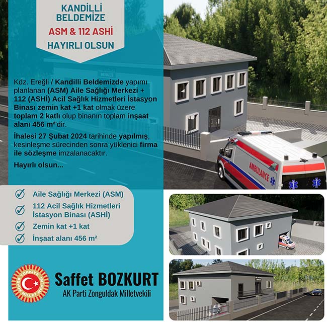 "Kdz. Ereğli / Kandilli Beldemizde yapımı planlanan (ASM) Aile Sağlığı Merkezi + 112 (ASHİ) Acil Sağlık Hizmetleri İstasyon Binası zemin kat +1 kat olmak üzere toplam 2 katlı olup binanın toplam inşaat alanı 456 metre karedir. İhalesi 27 Şubat 2024 tarihinde yapılmış, kesinleşme sürecinden sonra yüklenici firma ile sözleşme imzalanacaktır. Hayırlı olsun” dedi