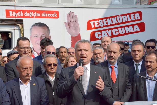 Daha sonra kürsüye çıkan kürsüye çıkan İl Başkanı Hakkı Güney, "Ben de çok sevinçliyim il başkanı olarak. 2014 senesinde değerli belediye başkanlarım seçimi kazandığı zaman partimi onurlandırdılar, şereflendirdiler. Başımızı 5 yıllık dönem içerisinde öne eğdirmediler. Partim adına kendilerine minnettarım. Ben ağabey diyorum. Bülent ağabeyi her yerdeki konuşmamda vadinin teknik direktörü diyorum. Bundan sonraki görev yapacak belediye başkanı arkadaşlarımıza vadide, onlara çok büyük destek olacağını, sosyal bir belediyeciliği, katılımcı bir belediyeciliği projeleriyle birlikte gerçekleştirebilmeleri için yardımcı olacağına yürekten inanıyorum. Biz 'martın sonu bahar' dedik, bahar Çaycuma'ya geldi. Kalben inanıyorum, bu dönemde Çaycuma'yı daha ileriye götürecek. Çaycuma halkı daha güzel projelerle buluşacak. Onun için ben kendisine başarılar diliyorum, Allah yolunu açık etsin. Allah ayağına taş değdirmesin" dedi.