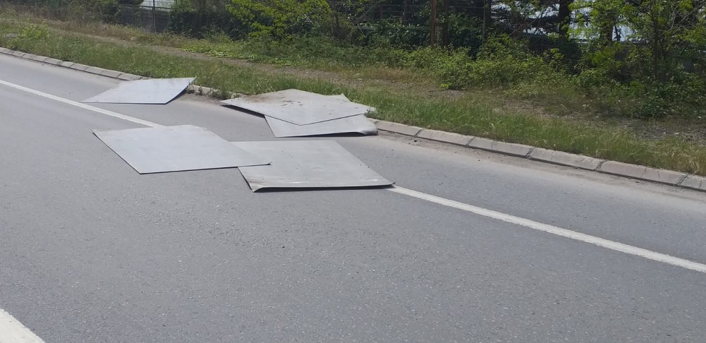 Zonguldak’ın Ereğli ilçesinde dilim sac yüklü TIR’ın açılan kapağından çevreye saçılan saclar, maket polis aracına, yön levhalarına ve aydınlatma direğine zarar verdi.