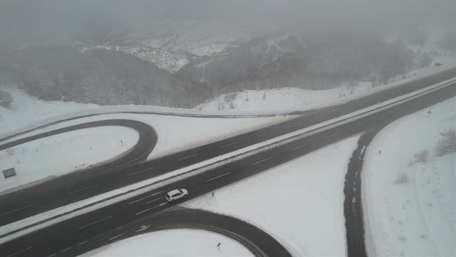 Kara yolunun son durumu dron ile havadan görüntülendi. Görüntülerde, beyaz örtüyle kaplanan yüksek kesimlerdeki trafik akışının normale dönmesi görüntülendi.