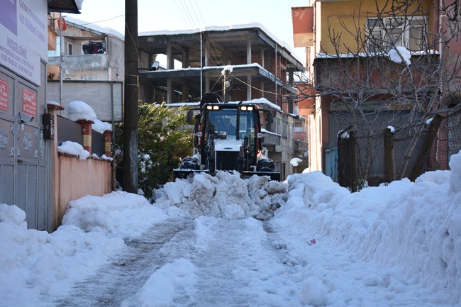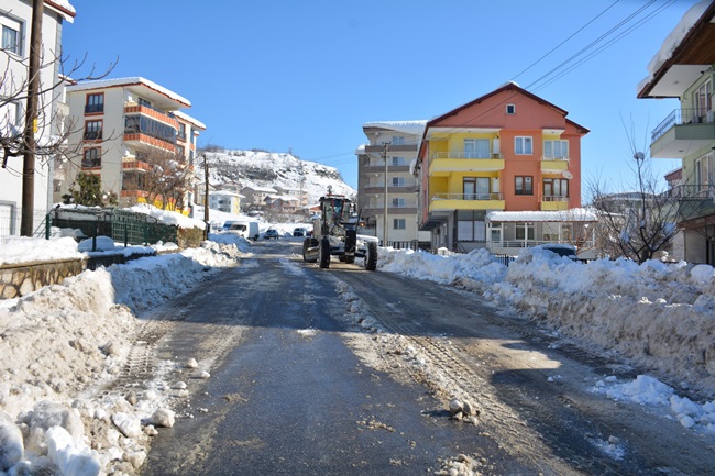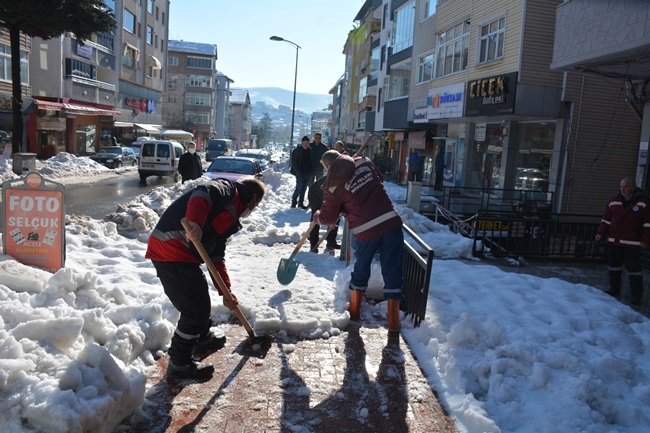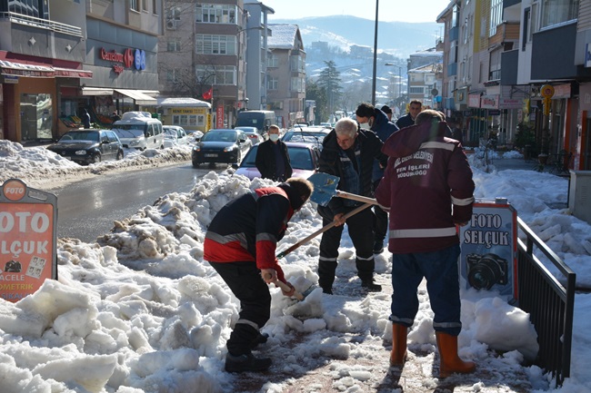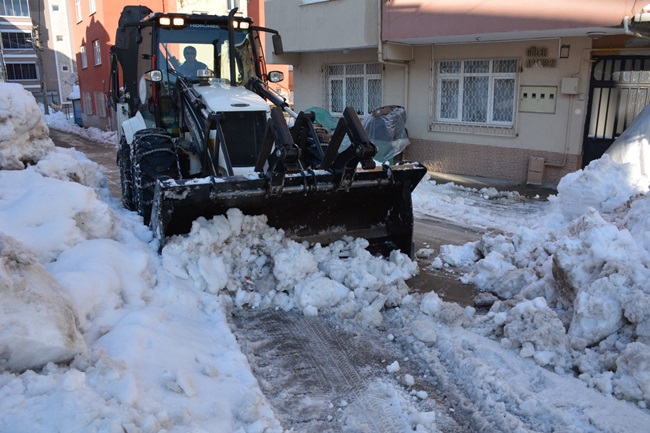Temizlik İşleri, Fen İşleri ve Su Kanalizasyon İşleri Müdürlüğü ekipleri ellerinde küreklerle kaldırım ve yaya yollarını temizliyor. İş makineleri kentin 600 kilometrelik yol ağında bütün mahallelerde temizlik çalışmalarına devam ediyor.