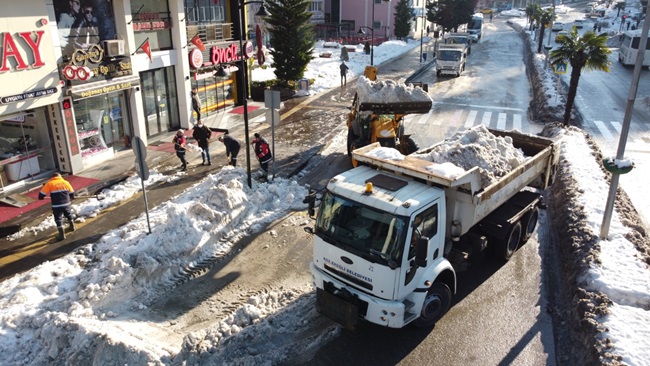Kdz. Ereğli’de 6 gün boyunca etkili olan yoğun kar yağışı, kentte yerini güneşe bıraktı. Kdz. Ereğli Belediye ekipleri yer yer 1 metreyi bulan kar kütlelerini kaldırma çalışmalarına dün geceden itibaren başladı. Esnafın yoğun olduğu kent merkezinde araç ve yaya yolunda oluşan kar yığınları iş makineleriyle kamyonlara yüklenip kaldırılıyor.