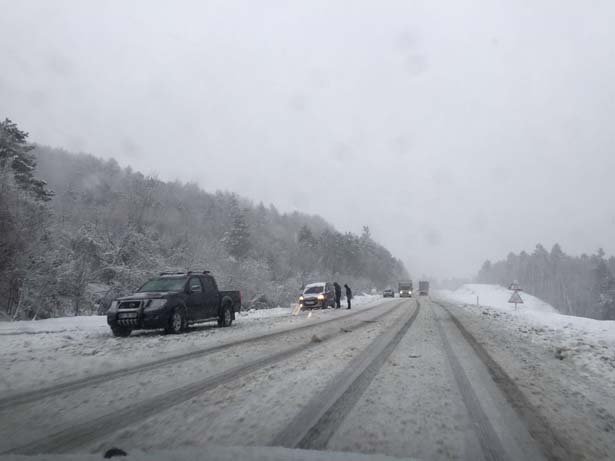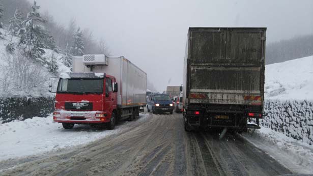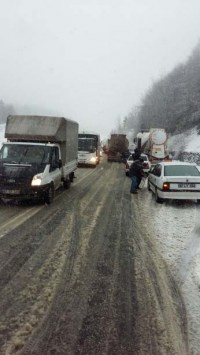Zonguldak- İstanbul karayolunda başlayan kar yağışı trafiği olumsuz etkiledi. Bazı araçlar yoldan çıkarak su kanalına düşerken, büyük araç ve TIR'ların geçişlerine de izin verilmiyor.