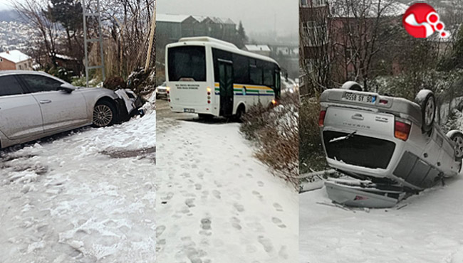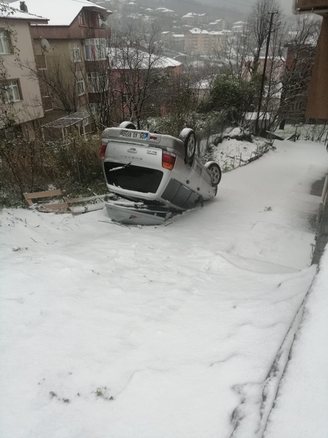 Ereğli’ de sabah saatlerinde etkisini gösteren kar yağışı ile birlikte kazalarda art arda geldi. İlk kaza Elmatepe Mahallesi’nde meydana geldi. İddiaya göre sabah saatlerinde çocuğunu okula götürmek için yola çıkan sürücü, karda aracın hâkimiyetini kaybetti. Yoldan çıkan otomobil takla atarak evin bahçe duvarına düştü. Kazada yaralanan olmazken araç kullanılamaz hale geldi.