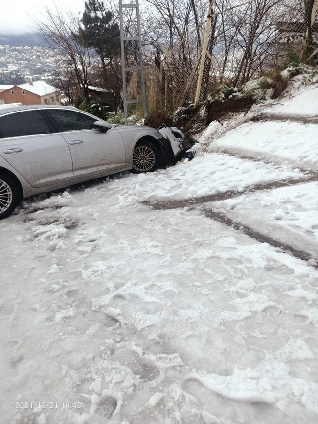 İkinci kaza Kepez Mahallesi’nde meydana geldi. İddiaya göre karda sürücüsünün direksiyon hâkimiyetini kaybettiği halk otobüsü kaldırma çarparak durabildi. Kazada yaralanan olmazken araçta maddi hasar oluştu.
