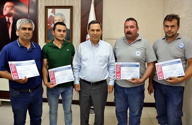 Belediye Fen İşleri Müdürlüğü operatörlerinden Cengiz Karaman ve Süleyman Ak ile Su ve Kanalizasyon İşleri Müdürlüğü'nden İlker Yavuz ve Engin Yanmaz'a sertifikalarını, Belediye Başkanı Hüseyin Uysal verdi.