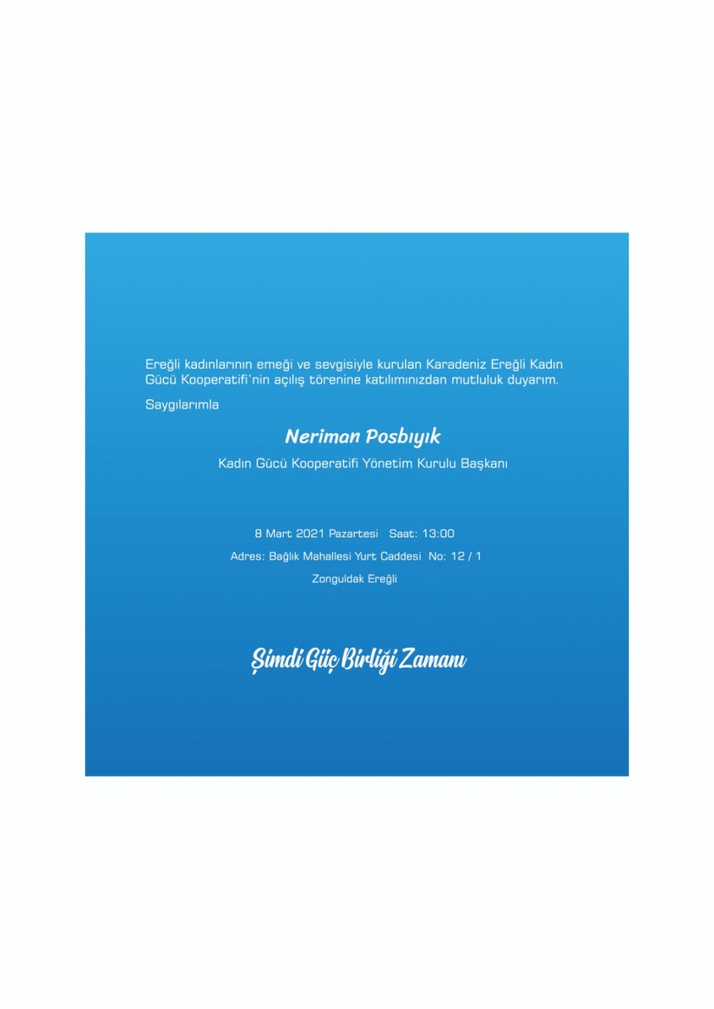 Kadın Gücü Kooperatifi Yönetim Kurulu Başkanı Neriman Posbıyık, Şimdi Güç Birliği zamanı sloganıyla; Ereğli kadınlarının emeği ve sevgisiyle kurulan Karadeniz Ereğli Kadın Gücü Kooperatifi’nin açılışı 08 Mart Dünya Kadınlar Günü’nde saat 13.00’de Bağlık Mahallesi Yurt Caddesi No:12/1 Karadeniz Ereğli adresinde açılacak.