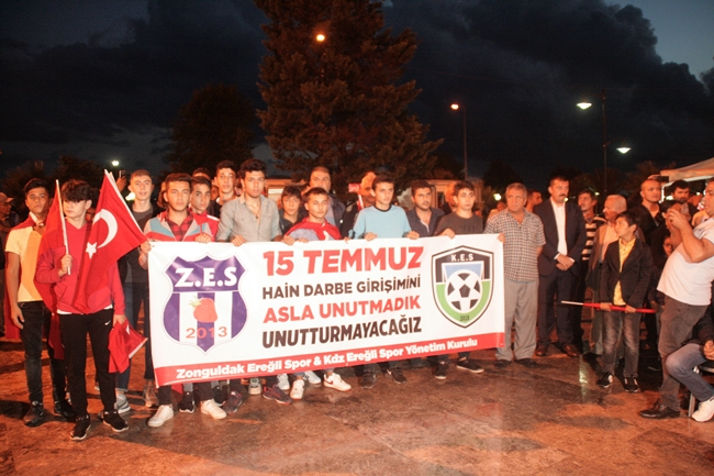 Etkinlik programı gereğince tam olarak 21.00’de saygı duruşunda bulunulması ve İstiklal Marşı’nın söylenmesi ile başlayan programda daha sonra Ereğli Müftülüğü’ne bağlı iki din görevlisi tarafından 15 Temmuz’un simgesi sayılan salalar okundu.