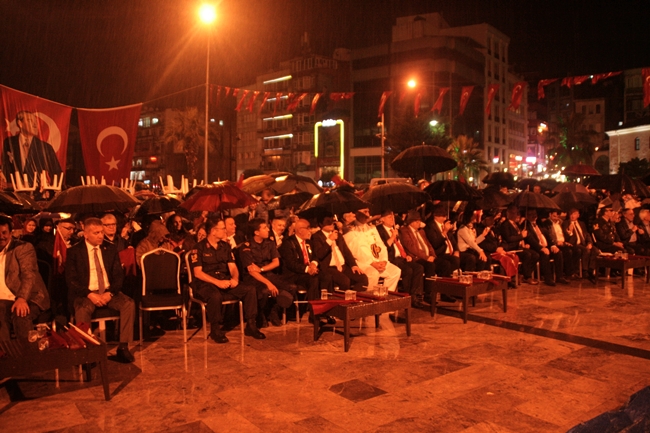 Sağanak yağmurun şiddetinin azalmaması üzerine, alandaki vatandaşların büyük bölümü tören alanından ayrıldı. Tören alanında bir bölümü şemsiyelerle korunan, bir kısmı da yağıştan ıslanan protokol, bir süre durum değerlendirmesi yaptıktan sonra, alana yakın noktada bulunan İskele Camisi hoparlöründen din görevlilerinin yaptığı dua eşliğinde 15 Temmuz şehitleri ve gazileri için dua etti; etkinlik daha sonra protokolün alandan ayrılmasıyla sona erdi.