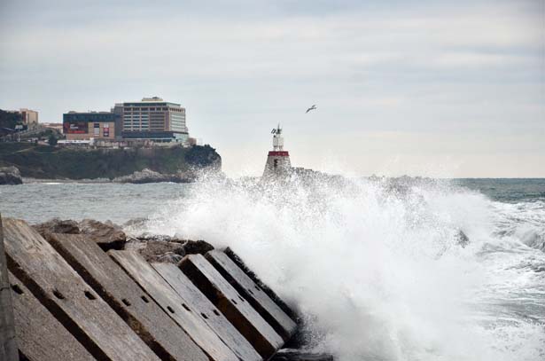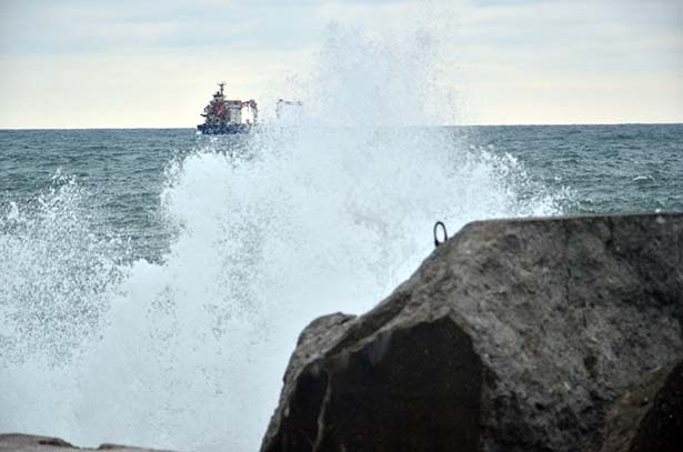 Zonguldak'ta 7 metrelik istinat duvarını aşan dev dalgalar limana girdi. Balıkçı tekneleri limana sığınırken, yük gemileri ise açıkta demirledi.