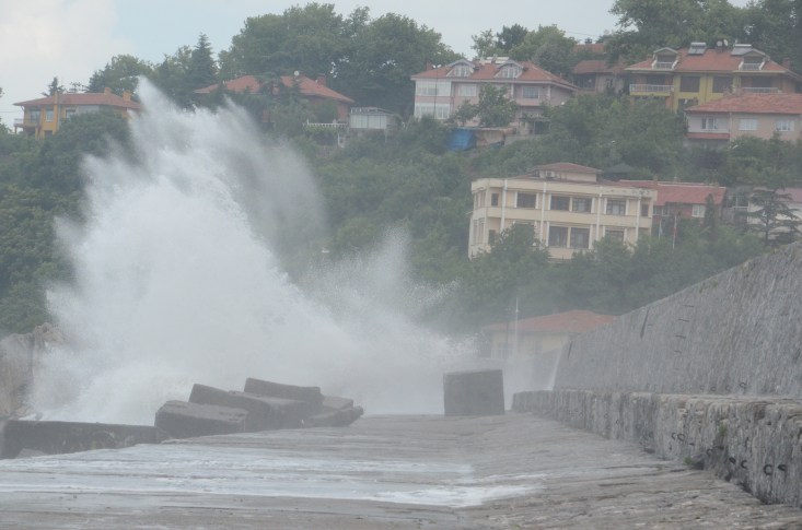 Zonguldak'ta da, şiddetli rüzgar nedeniyle Karadeniz'de oluşan dalgalar 7 metrelik istinat duvarına ulaştı. Sabah saatlerinden bu yana etkili olan şiddetli yağış ve fırtına sebebiyle limana girebilmek için açıkta sıra bekleyen gemiler zor anlar yaşadı.