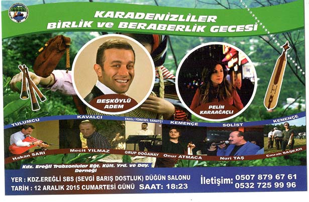 Kdz Ereğli Trabzonlular Eğitim Kültür Yardımlaşma ve Dayanışma Derneği tarafından Karadenizliler Birlik ve Beraberlik Gecesi düzenleneceği bildirildi.