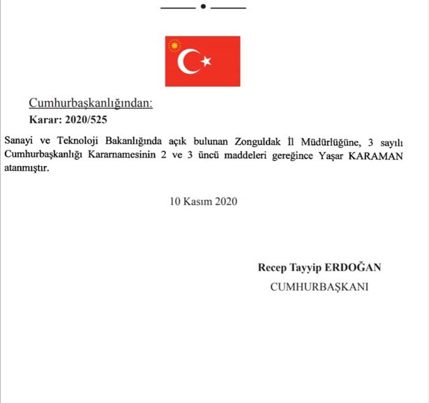 Sanayi ve Teknoloji Bakanlığı Zonguldak İl Müdürlüğü görevine Yaşar Karaman atandı. Cumhurbaşkanlığı Kararnamesi ile atanan Karaman'ın ataması Resmi Gazete'de yer aldı. Vekaleten yürütülen il müdürlüğü görevine atanan Karaman; " Cumhurbaşkanımızın takdir ve tensipleri ile Zonguldak Sanayi ve Teknoloji Bakanlığı İl Müdürü görevime asaleten 11 Kasım 2020 Tarihli ve 31301 sayılı Resmi Gazetede yayınlanan 2020/525 sayılı kararı ile atanmış bulunuyorum.